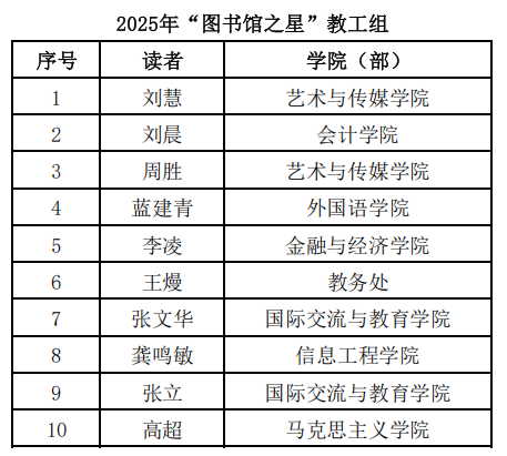 武汉学院第十六届读书月活动已持续开展,图书馆依据2025年度师生读者的纸质图书借阅数据、阅读推广活动参与情况、文献荐购贡献等多项指标,综合评选出学生组与教工组各十名“图书馆之星”,现予以公布。