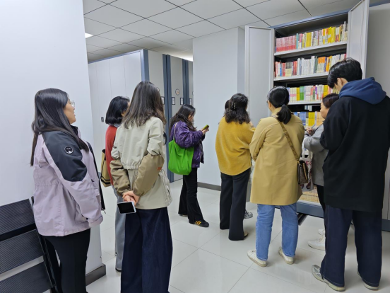 座谈结束后,在温爱莲馆长的陪同下,严萍馆长一行实地参观考察了我校图书馆的密集书库。读者服务部主任李丹及部门人员结合库内实际情况,对藏书布局、排架方式、环境控制、存取流程等进行了现场讲解与演示。此外,我馆馆员还向来访同仁演示了图书管理系统中关于密集书库文献调度、信息变更等环节的具体操作流程,使来访同仁对我馆密集书库的运作模式有了更为直观和深入的了解。