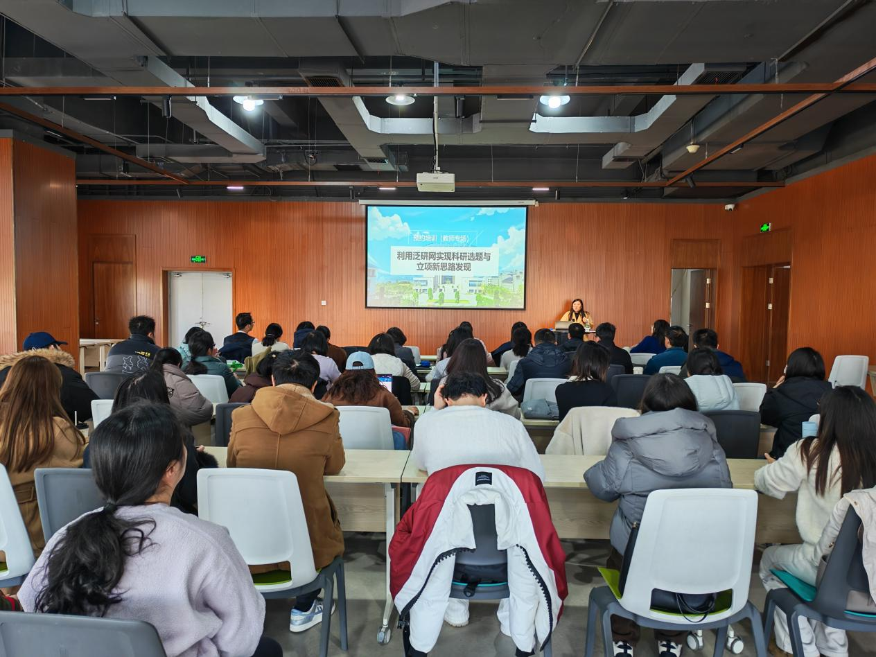 为深化科研服务,助力教师提升项目申报质量与学术创新能力,1月8日下午14时,由图书馆与科研处联合举办的“利用泛研网实现科研选题与立项新思路发现”专题培训在陈一丹伉俪图书馆IC创客空间顺利举行,本次培训系图书馆预约培训系列第十三期(教师专场),由图书馆副馆长周莹主持,来自全校各院系的50余位教师参加了此次培训。