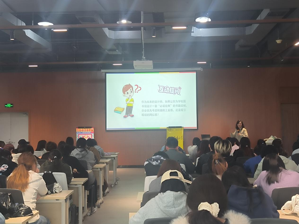 分享尾声,温爱莲向在场学生抛出一个设计的问题:“作为未来的设计师,如果让你为学校图书馆设计一套‘必读经典’的书籍装帧,你会优先考虑耐磨的工业感,还是吸引眼球的网红感?”这一问题引发了同学们对设计伦理与实用价值的深入思考。