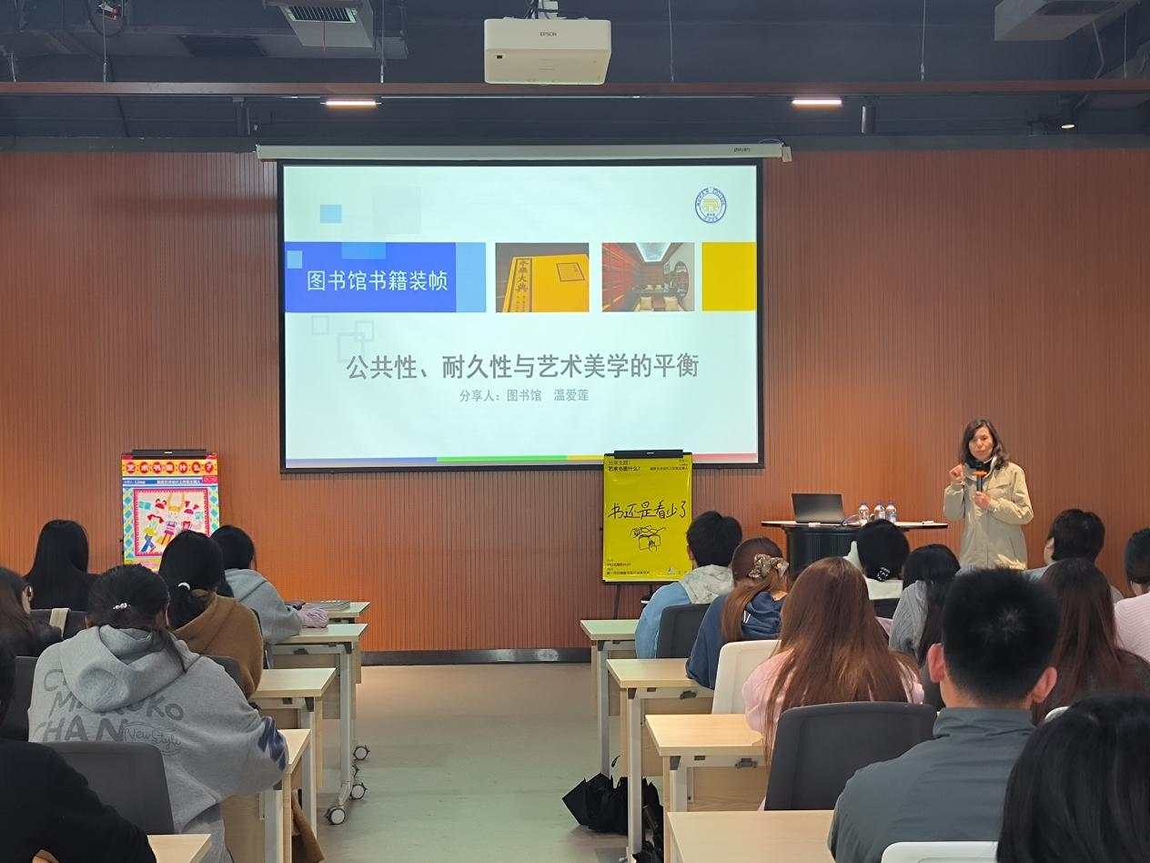 温爱莲以《图书馆书籍装帧:公共性、耐久性与艺术美学的平衡》为题展开分享。她结合图书馆丰富的馆藏资源,围绕“书的价值与艺术书的收藏”这一主线,简述了图书馆不同类型书籍的收藏逻辑,并重点分析了馆藏艺术书的独特之处。
